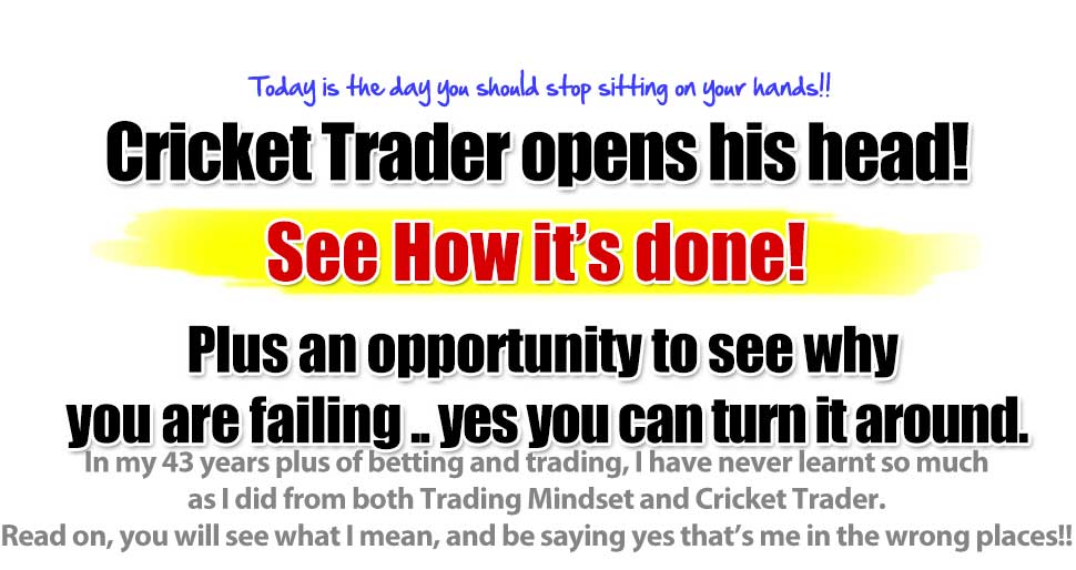 5 Minute Video explains it. There are two products on this page, and as a pair they are POWERFULL. 1. Trading Mindset ( absolute must read.) 2. Cricket Trader ( brilliant how to step by step trade all forms of Cricket.) Lets start with the Cricket Trader and progress to Trading Mindset.. then the bonus discount offer! Millions are bet everyday on Cricket around the world especially T20, 3 hours of rapidly changing prices, a traders dream! In the recently completed Big Bash in Australia, over £30 million was traded in most matches in that 3 hours. When the matches started there was less than £5 million in the pool, and 3 hours later another £25 million added! One day internationals are rocking in the UK, time to invest!! Cricket format: One Day International